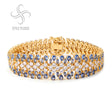 A luxurious gold-toned bracelet adorned with sparkling cubic zirconia and vivid blue spinel stones. The elegant mix of round and teardrop-shaped gems creates a shimmering, woven design that adds sophistication to any special occasion look. 7.09''